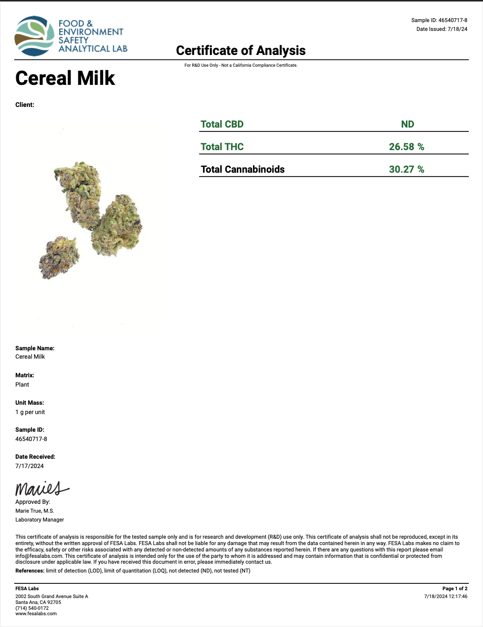 Cereal Milk is a hybrid cannabis strain by crossing Cookies and Cherry Pie. Reminiscent of a great morning breakfast, Cereal Milk's taste and effects brings you back to a simpler time. The flavor profile is delightful, as users will notice sweet hints of vanilla and butter with herbal undertones. Users that consume Cereal Milk report feeling giggly, relaxed, and some even say aroused, making this a go-to strain for any point in the day.