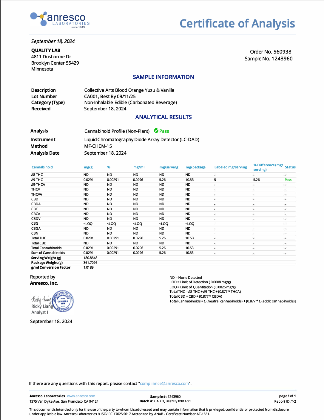 Tried & True. The Collective Project's fan-favorite beverage has big citrusy notes of Yuzu and Blood Orange, blended with vanilla - making this a treat! With added cannabis citrus terpenes to round out the flavor profile, you'll forget you're drinking a cannabis derived beverage in the first place. It's giving orange creamsicle, but carbonated... and absolutely delicious. Trust us, this one is a winner.