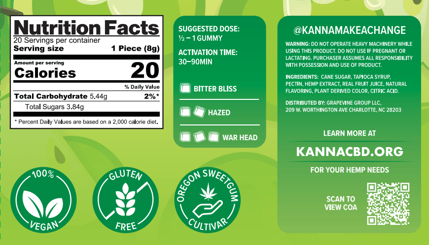 Ingredients: Cane Sugar, tapioca syrup, water, pectin, hemp extract, real fruit juice, natural flavoring, plant derived color, citric acid
